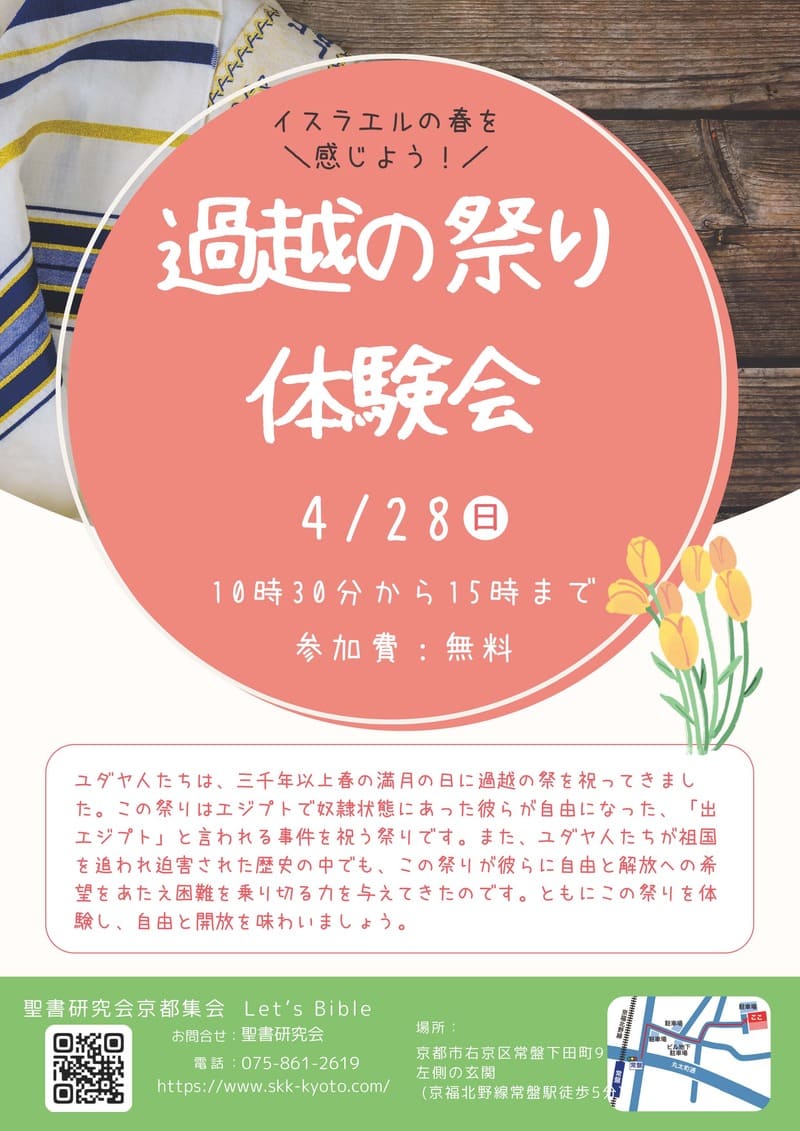 イスラエルから若者を招き、共にこの過ぎ越し祭を簡単に体験し、学びの時を持ちます。この機会に過ぎ越しの祭を体験し、解放と自由という聖書のメッセージを学んでみませんか?